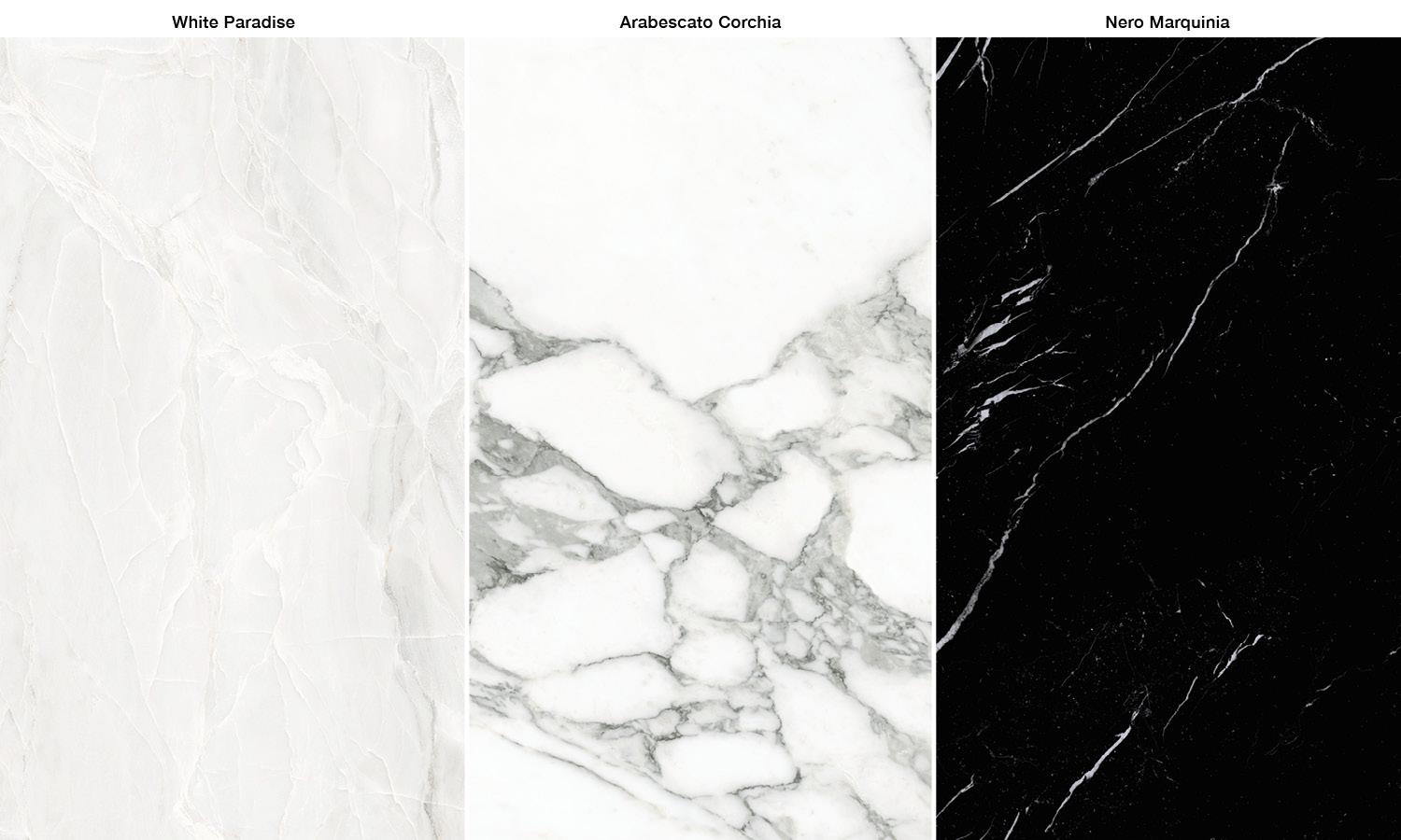 La collezione è progettata a partire da tre diversi marmi - Nero Marquinia, White Paradise e Arabescato Corchia in versione naturale e full lappato - creati per giocare su accostamenti cromatici netti e composizioni dal forte impatto visivo.