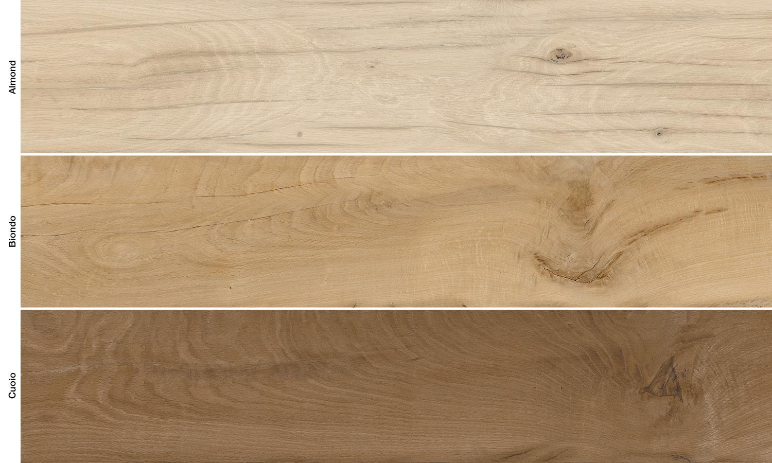 Revival si distingue per la naturalità del prodotto e l’aspetto realistico: il lavoro sulla materia rispetta il valore intrinseco del legno e celebra il potenziale che racchiude. Il legno di quercia conserva la sua inafferrabile essenza piena di calore e carattere. La superficie non è uniforme, ha una tessitura grezza e una grana irregolare che le conferiscono un aspetto raffinato ed elegante. Le venature inimitabili, forti e prominenti, e la gamma di colori dalla bellezza naturale raccontano la scelta di un legno perfettamente imperfetto.