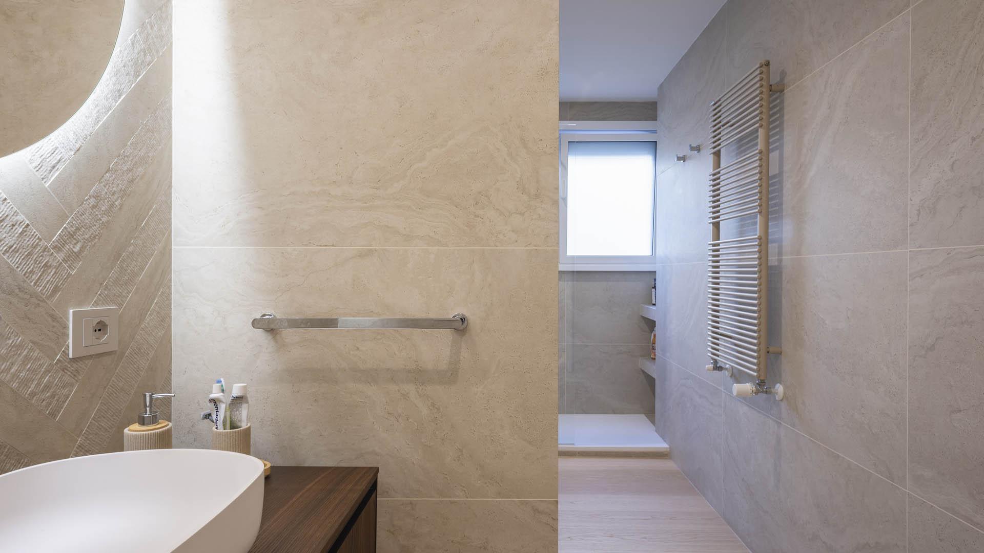 La ristrutturazione di questa dimora, situata nel prestigioso Palazzo Domus, è stata arricchita dalla collezione Unique Travertine di Provenza, un omaggio al fascino senza tempo del travertino. In particolare, nel bagno degli ospiti, la finitura Minimal nella tonalità Cream crea un’atmosfera accogliente ed elegante, mentre le piastrelle 7,5x60 cm, disposte a spina di pesce e alternate tra le finiture Minimal e Ruled, donano un tocco dinamico e sofisticato all’ambiente.