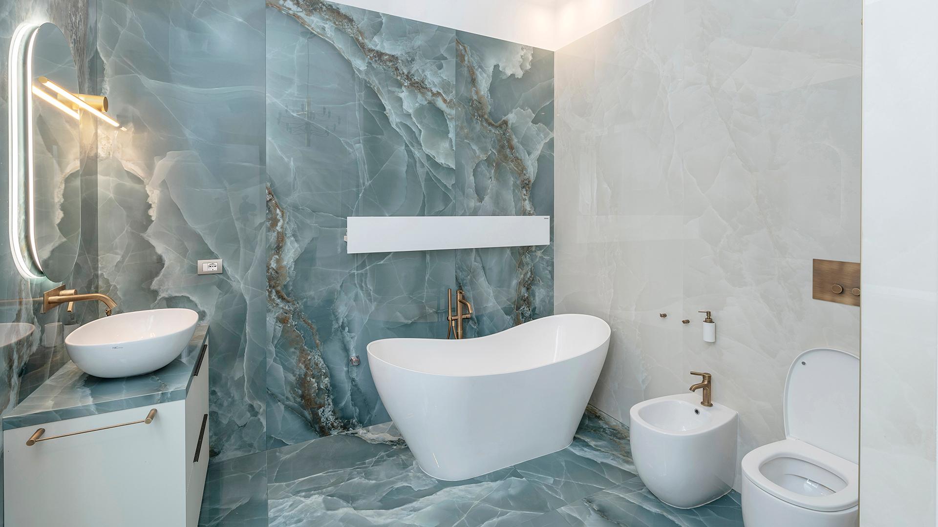 Per la ristrutturazione dei due bagni di Chef Max Mariola, Emilgroup ha utilizzato il meglio delle sue eccellenze. Per il primo bagno la scelta è stata Unique Travertine Minimal White 120x278 e 120x120 + Elements: una sintesi perfetta tra estetica e prestazioni elevate e la stupenda matericità calcarea del travertino. Per il secondo, invece, gli esperti di Emilgroup hanno osato con la meravigliosa collezione Tele di Marmo Onyx Green e Ivory, sempre nelle grandi lastre 120x278 e 120x120: una linea elegantissima dedicata ai marmi più ricercati al mondo. Le sfumature e le trasparenze tipiche dell’onice si stratificano sotto la superficie, restituendo una straordinaria tridimensionalità e luminosità alle superfici.