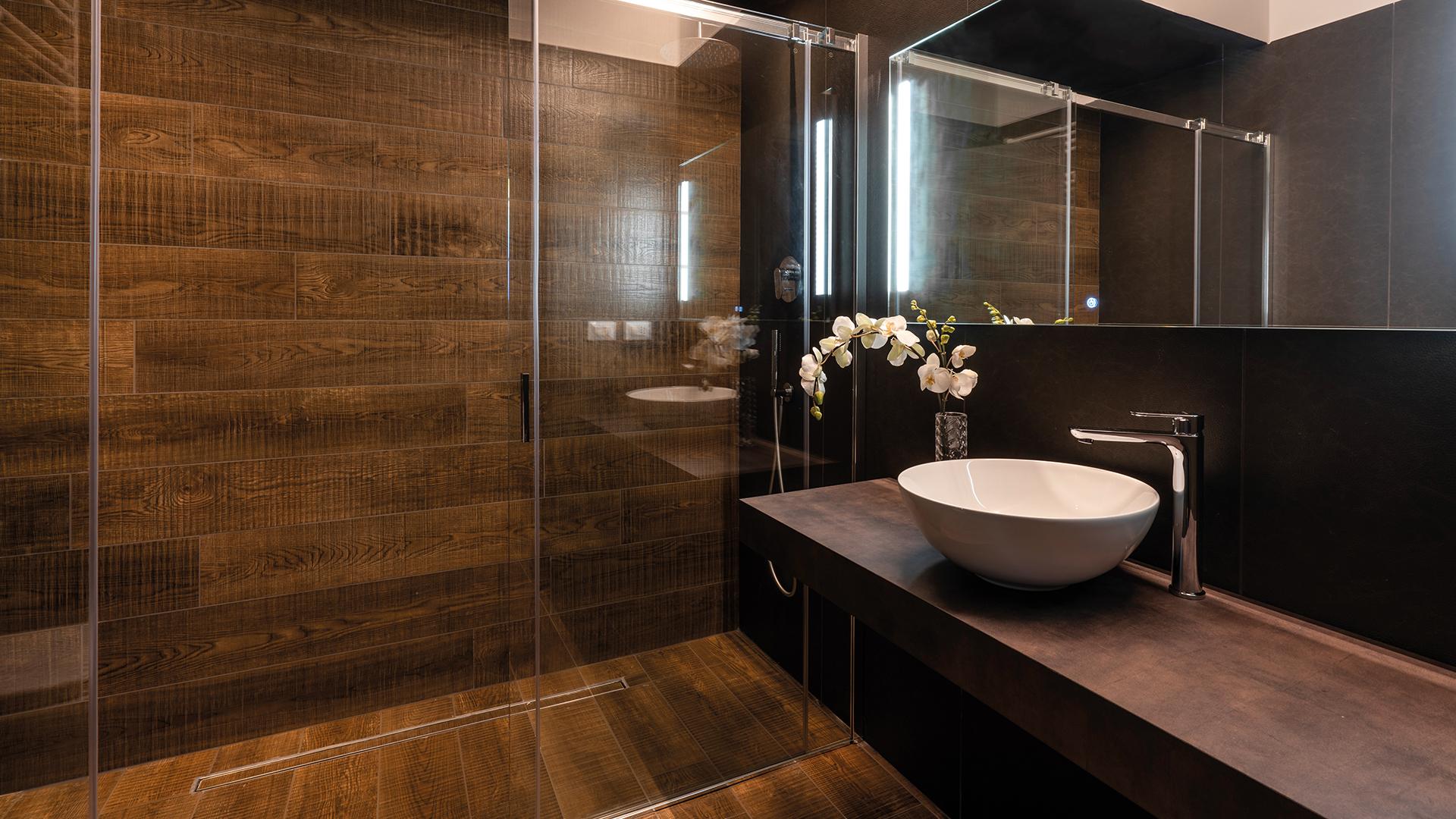 Le nove suites si differenziano per piccoli particolari di design, tutti giocati grazie alle combinazioni di materia e colore di No-Code, nelle versioni legno, pelle e pietra. In alcune suites ai pavimenti realizzati con No-Code Legno, scelto nelle finiture rovere cerato e rovere taglio sega, formato 20x120 cm, è stato abbinato No-Code Pelle per i rivestimenti, nelle finiture cuoio martellata e cocco, formato 60x120 cm, per creare un’atmosfera raffinata e accogliente, moderna e rilassante al tempo stesso. In altri ambienti, per ricreare uno spazio ancora più intimo e ovattato, è stata utilizzata la versione No-Code Pelle martellata per i pavimenti, mixata a No-Code Cocco per le rifiniture: il risultato è un ambiente seducente e cosmopolita, ricercato e accogliente, grazie alla morbidezza tattile e visiva delle superfici. Altre suites sono state realizzate interamente con No-Code Lavagna, giocando con cromatismi opposti - antracite, avorio e grigio - per creare giochi di profondità e grafismi e dare un carattere più architettonico ed elegante allo spazio.