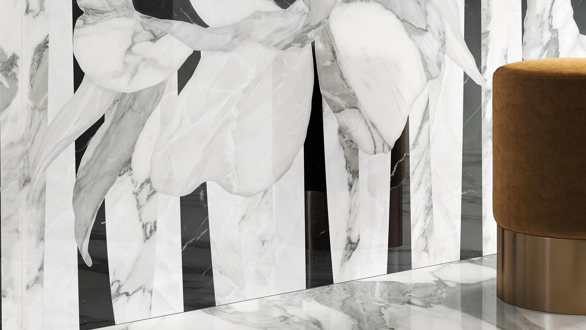 Fra le proposte effetto marmo, Tele di Marmo Selection by Emilceramica è una collezione in cui predominano contrasti forti ma estremamente eleganti, sottolineati all’occorrenza dal decoro Tarsia, che si ispira all’antica tecnica dell’intarsio e dà vita a motivi floreali suggestivi. Il grande formato è disponibile, nel formato massimo, in 120x278cm con spessore 6,5mm. L’intramontabile raffinatezza di Tele di Marmo by Emilceramica omaggia in modo pulito e autorevole il marmo nella sua classica forza architettonica: le quattro combinazioni di colori (Breccia Braque, Calacatta Renoir, Frappuccino Pollock e Statuario Michelangelo) possono essere usate in affiancamento alle opzioni Battuto di Listelli, Doghe (con il medesimo schema di colori della serie base) e Seminato di tessere.