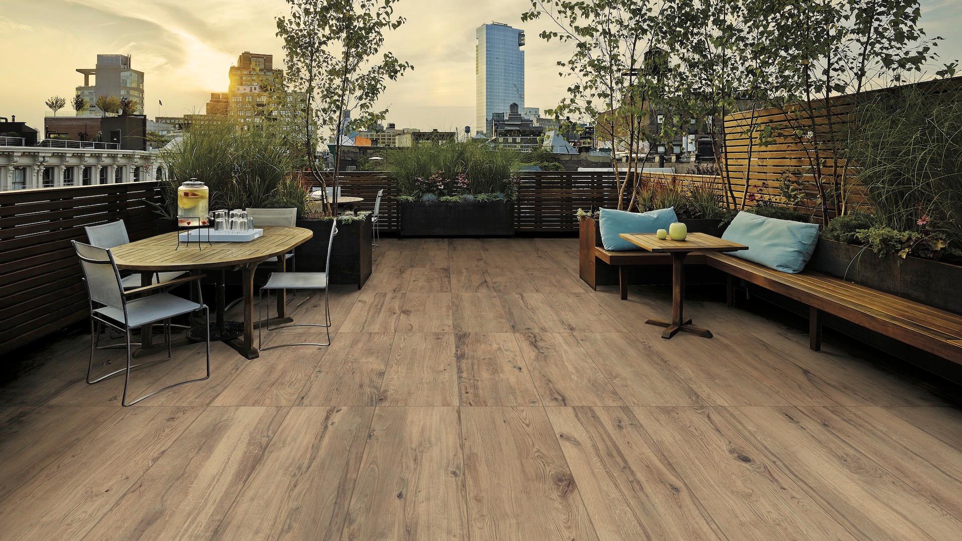 Le possibilità creative del gres porcellanato applicato alle piastrelle per balconi non si esauriscono con la geometria. Utilizzate da diverso tempo per rivestire gli ambienti interni, anche negli spazi esterni la scelta di percezioni e finiture effetto naturale non conosce confini. Un’opzione di grande carattere per le piastrelle dei terrazzi è l’effetto legno. Le caratteristiche di resistenza e autenticità del gres permettono infatti di ottenere una finitura naturale e di godere del fascino del legno anche in ambienti esterni. La collezione Millelegni by Emilceramica è la soluzione ideale per portare le percezioni dei legni provenienti da tutto il mondo nel pavimento degli spazi esterni. Le varianti del nostrano Noce selvatico (30 x 120 cm) e dello Scottish Oak (40 x 120 cm e disponibile nello spessore di 20 mm), in particolare, doneranno alla pavimentazione di terrazzi e balconi uno stile unico e di grande personalità – il fascino accogliente e rilassante del legno raggiunge gli spazi esterni, per un effetto ricercato e ultramoderno.