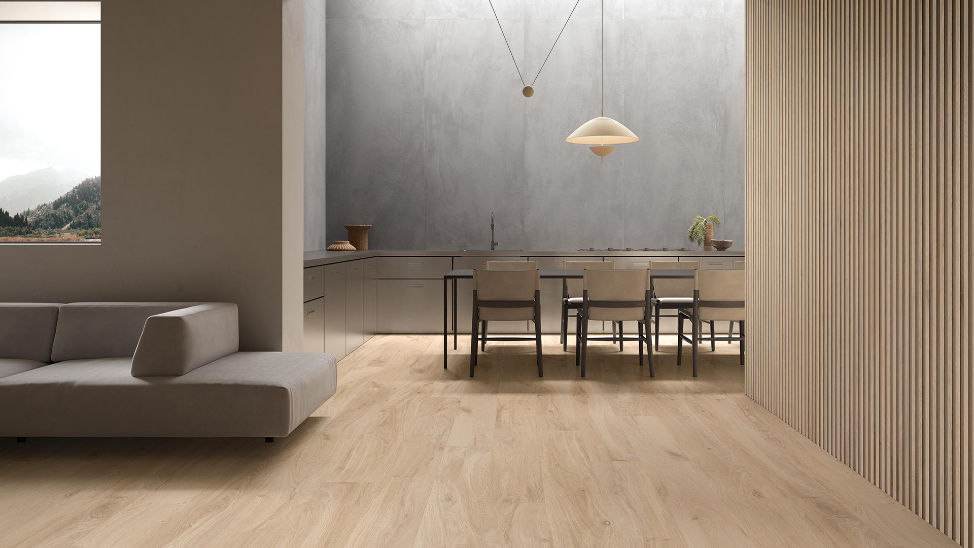 Le colorazioni disponibili nella collezione—Rovere Pallido, Rovere Dorato, Rovere Imbrunito—complementano la palette cromatica neutra e terrosa tipica dello stile wabi-sabi, creando un'atmosfera calda e accogliente, ideale per uno spazio conviviale come la cucina. Le dimensioni innovative delle doghe permettono di adattarsi a composizioni funzionali e esteticamente coerenti con la disposizione minimalista e aperta della cucina.