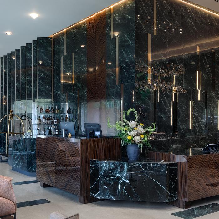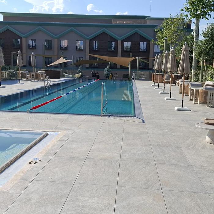 In questo contesto, le collezioni Emilgroup interpretano con versatilità la pluralità degli spazi: nella hall, l’accostamento delle collezioni di Emilceramica Mapierre e Tele di Marmo Revolution - Verde Saint Denis, conferisce carattere e identità all’area di accoglienza. Le superfici realizzate con Unique Travertine by Provenza, nella versione Vein Cut Cream, definiscono le aree wellness con eleganza contemporanea, mentre gli spazi intorno alla piscina esterna, rivestiti con Oros Stone by Ergon nella tonalità Grey, creano ambienti in cui prestigio e autenticità si fondono perfettamente.