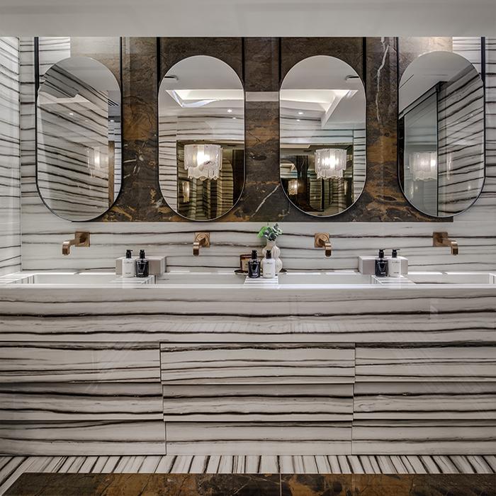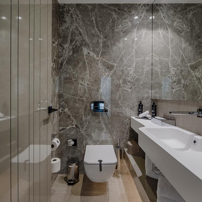 Nei bagni delle suite, diverse combinazioni di lastre in spessore 12 mm arricchiscono gli interni con giochi di contrasti sofisticati. Level Marmi è proposta nelle tonalità Zebrino, Macchia Vecchia e Moon Grey, accostata alle collezioni Emilceramica Tele di Marmo Reloaded nella tonalità Fossil Brown Malevic e Tele di Marmo Onyx nella tonalità Onyx Blue. Insieme, queste superfici definiscono ambienti preziosi e distintivi, sottolineando l’equilibrio tra estetica e funzionalità.