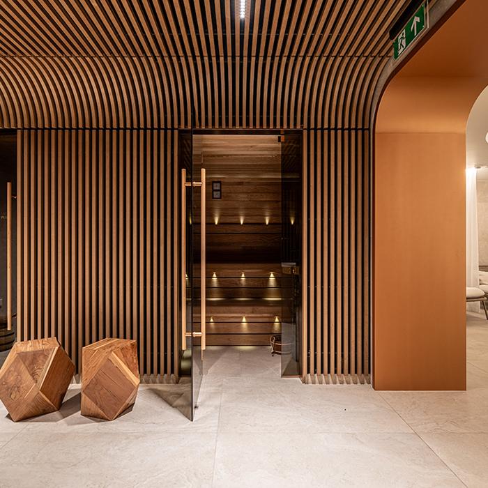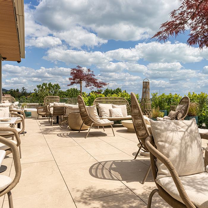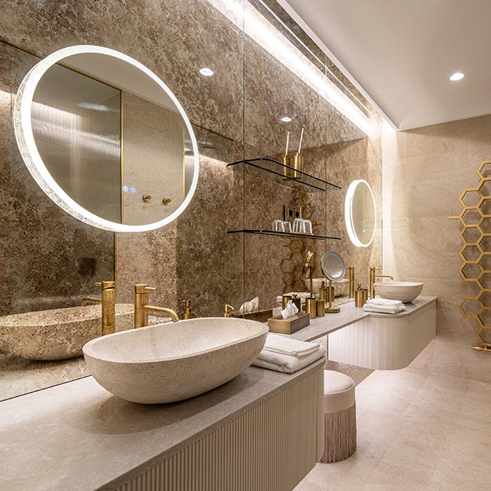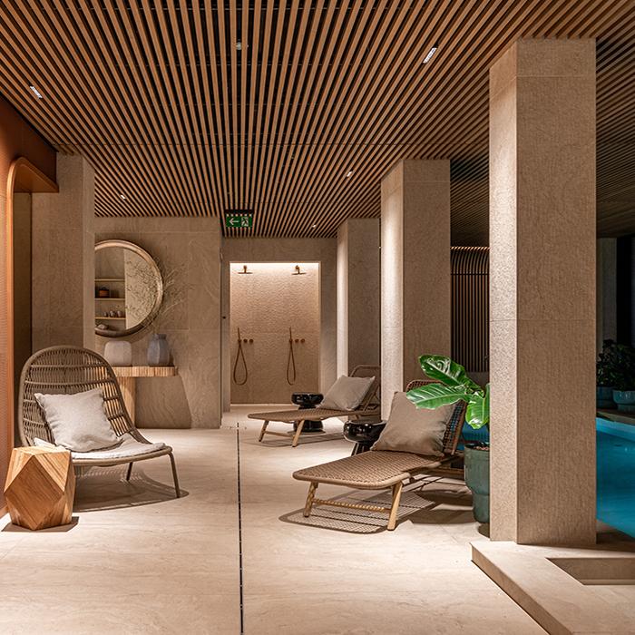 Unique Travertine by Provenza interpreta questo dialogo tra passato e presente, unendo la forza di un materiale classico come il travertino all’eleganza del design contemporaneo. La collezione, nel formato 60x120 nelle versioni Minimal Cream e Ruled Cream, è stata impiegata nelle aree wellness e nel rooftop, creando spazi raffinati che dialogano con l’architettura storica. Nei bagni delle suite, la palette si arricchisce con la variante Minimal Chocolate, introducendo contrasti caldi e sofisticati che valorizzano gli spazi privati.