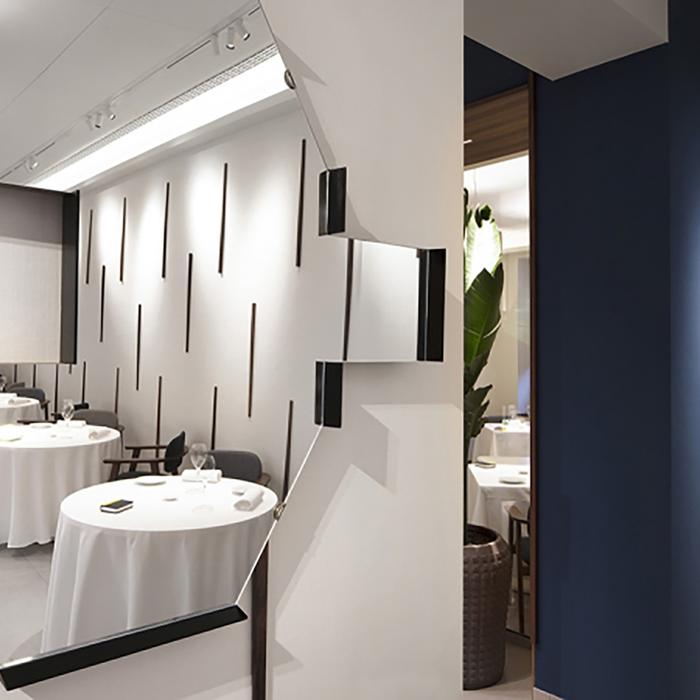 La scelta delle piastrelle StoneTalk by Ergon e Vulcanika by Provenza ha reso possibile un dialogo tra le pavimentazioni e le superfici verticali. Sui pavimenti sono state utilizzate piastrelle StoneTalk, in formato 60x120 e in due diversi colori: White per le sale da pranzo e Sand per le strade che portano agli accessi e al Theatrum. Il colore Sand viene inoltre applicato in tutti gli ambienti per la zoccolatura, in formato 120x120, e per il pavimento del bagno con l’aggiunta di un rivestimento verticale della collezione Vulcanika by Provenza nel colore White. L’utilizzo di queste due collezioni ha conferito agli ambienti del ristorante un mix di performance (antiscivolo, anticorrosione, antincendio, facilità di posa, di manutenzione e igienizzazione delle superfici) oltre ad averlo reso elegante e con un design minimal.